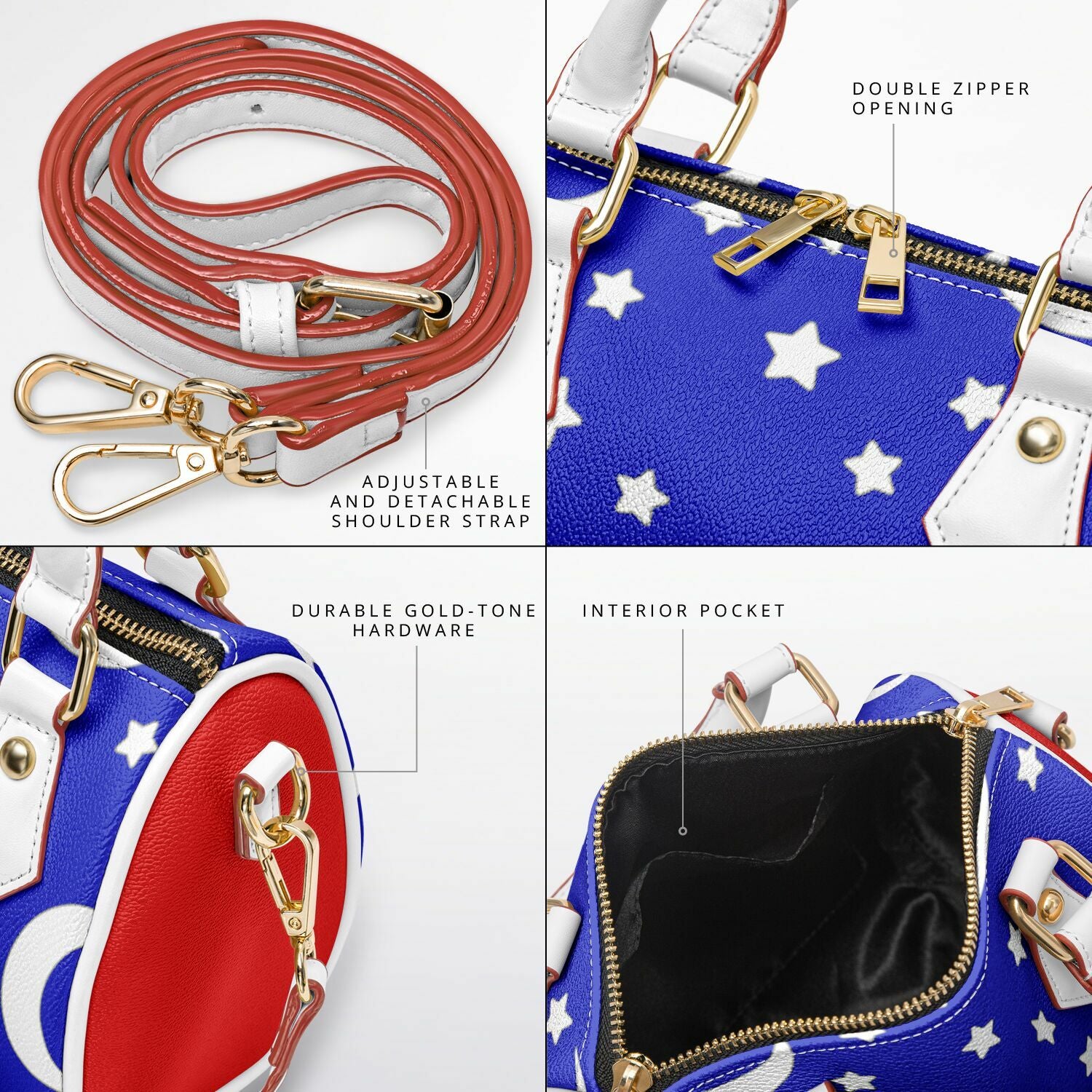 • Golden hardware with gold zipper and black zipper lining
